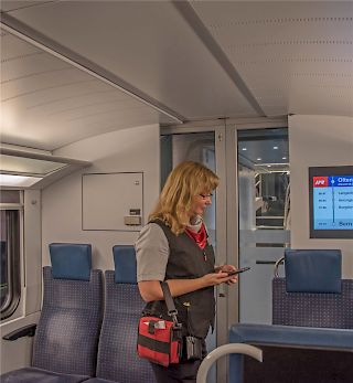 Ich treffe Sabrina Tessmer um 05.45 Uhr – für mich noch mitten in der Nacht – auf Gleis 13 am Zürcher Hauptbahnhof. Trotz Frühschicht sieht die Zugbegleiterin ganz munter aus in ihrer SBB-Uniform. Sie trägt sogar das Foulard, obwohl es heiss werden soll heute. Der Zugchef teilt ihr die vier Wagen der vorderen Zugkomposition zu und wir machen uns auf den Weg nach vorne.