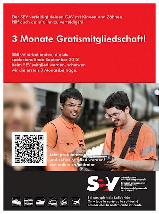 Die zunehmenden Beitritte in den SEV haben den Vorstand dazu bewogen, die Werbeaktion für Neumitglieder von der SBB zu verlängern. Diese profitieren von drei Monaten Gratismitgliedschaft, wenn sie dem SEV bis Ende September beitreten. Eine Geste, die Nichtmitglieder dazu motivieren soll, sich in der Zeit der sehr schwierigen GAV-Verhandlungen mit der SBB gewerkschaftlich zu organisieren.
