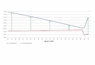 Die Pensionskasse SBB hat beschlossen, den Umwandlungssatz (für die Berechnung der Renten aus dem Alterskapital) von heute 5,18% auf 4,73% zu senken, und zwar in vier Schritten ab 1. März 2019 bis 1. Januar 2022. Dies deshalb, weil die Renditeerwartungen tief sind und weil die PK mit dem aktuellen Deckungsgrad (107,1% per 1. Januar 2018) keine grossen Reserven hat, zumal der Anteil der Rentner/innen an den Versicherten mit 46% sehr hoch ist. Die Senkung des Umwandlungssatzes würde die künftigen Renten um rund 7% senken, wenn auf Abfederungsmassnahmen verzichtet würde – siehe rote Kurve in der Grafik (die blaue Kurve zeigt die Renteneinbusse mit den zwei Abfederungsmassnahmen, wie sie der Verwaltungsrat SBB am 17. Mai genehmigt hat):