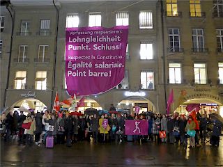 Nach dem Arbeitstag trafen sich die Frauen auf dem Berner Helvetiaplatz. Regen, Wind und die kalten Temperaturen konnten die 240 Delegierten auf ihrem Weg zum Theaterplatz nicht aufhalten. Vor einer perfekten Kulisse erinnerten sie lautstark daran, dass die Lohngleichheit, die seit dem 14. Juni 1981 in der Verfassung verankert ist, endlich respektiert werden muss. Die Frauen forderten das Parlament beim Thema Lohngleichheit auf, der Ständeratskommission, die für die Revision des Gleichstellungsgesetzes (GlG) verantwortlich ist, gegenüber mutiger zu sein. Das Mass ist langsam aber sicher voll und im Vergleich zu Island ist die Schweiz von der Lohngleichheit noch weit entfernt. Island ist das erste Land weltweit, das die Arbeitgeber gesetzlich zur Lohngleichheit zwischen Mann und Frau verpflichtet. Ab Januar 2018 müssen private sowie öffentliche Unternehmen mit mehr als 25 Angestellten anhand von verschiedenen Dokumenten beweisen, dass unter ihren Angestellten Lohngleichheit herrscht, ansonsten werden sie gebüsst. Die Schweizer Gesetzesrevision sieht weniger einschneidende, verbindliche Massnahmen vor – trotz des schüchternen Versuchs des Bundesrats, die Massnahmen gegen Diskriminierung zu verstärken.