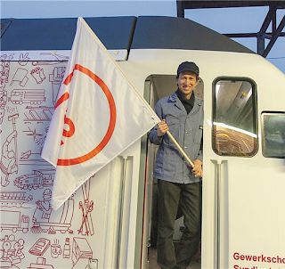 Aber lasst uns von vorne beginnen: Es ist 10.45 Uhr, als im Bahnhof Bellinzona die Tessiner SEV-Gewerkschafter/innen die Fahnen in die Hand nehmen, um «ihre» Lokomotive auf Gleis 6 in Empfang zu nehmen, bald begleitet von Kolleginnen und Kollegen aus anderen Ecken des Landes. Der Moment ist bedeutsam: Einige der Teilnehmenden waren bereits 25 Jahre zuvor an der Einweihung der Lok des 75-Jahr-Jubiläums mit dabei...