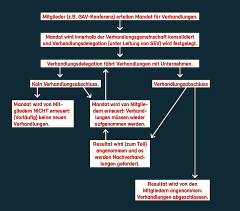 Sehr wichtig hervorzuheben ist, dass wir für die Zustimmung zu Verhandlungsergebnissen wiederum ein Mandat benötigen. Falls das Verhandlungsergebnis vom ursprünglichen Mandat abweicht, muss das Resultat zwingend in der GAV-Konferenz besprochen und abgenommen werden.