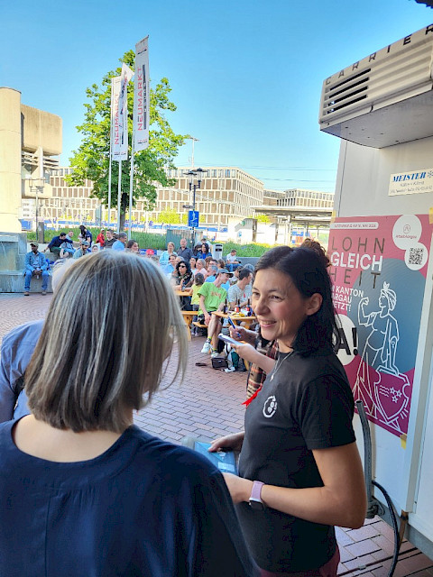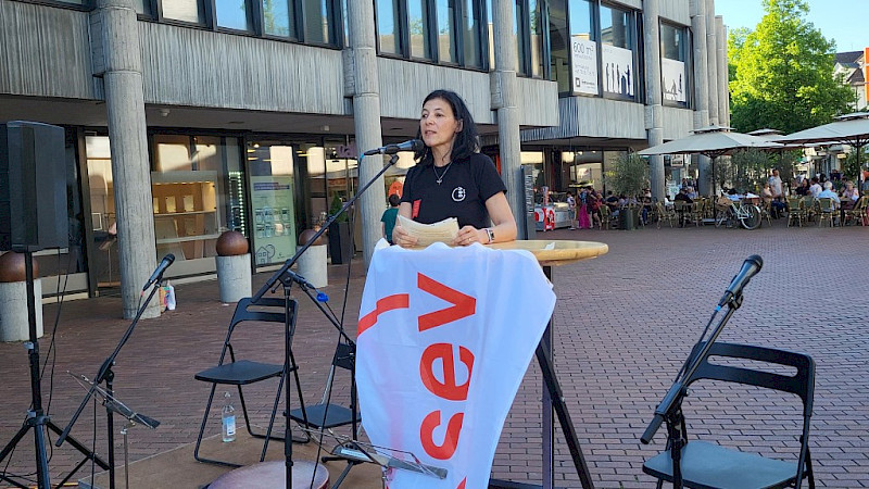 In Brugg (AG) sprach LPV-Zentralpräsidentin Hanny Weissmüller über ihren Alltag als Lokführerin und die «stille» Arbeit ihrer Kolleg:innen in Rangier, Wagenreinigung oder Betriebszentralen, die weniger sichtbar ist, aber ebenso unverzichtbar für eine gut funktionierende, saubere Bahn. Dennoch will die Leitung ständig auf dem Rücken des Personals sparen, z. B. bei den laufenden Verhandlungen über die bereichsspezifischen Arbeitszeitregelungen … Weiter hielt Hanny fest: «Die Aggressionen gegen das Personal haben seit Covid exponentiell zugenommen. Diejenigen, die jeden Tag in Schichtarbeit ihr Bestes geben, verdienen Respekt und Schutz!» (Ganze Rede siehe unten.)