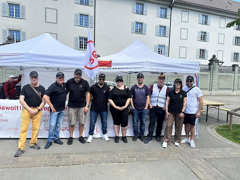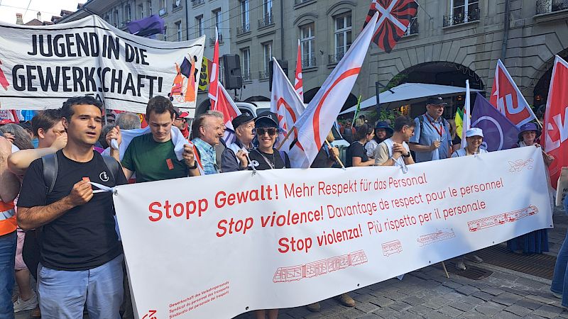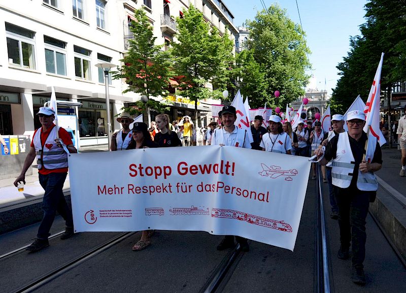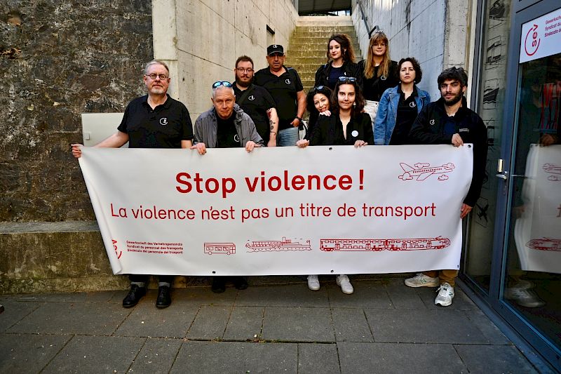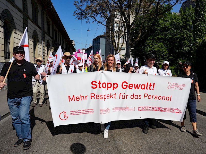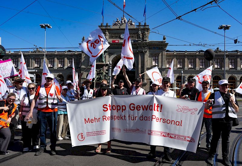 In mehreren Städten gingen SEV-Mitglieder mit einem Transparent auf die Strasse mit der Forderung: «Stopp Gewalt! Mehr Respekt für das Personal». Die Ansage ist klar: Behörden, Unternehmen und die Bevölkerung müssen endlich handeln, um die zunehmende Gewalt gegen das Verkehrspersonal zu stoppen.