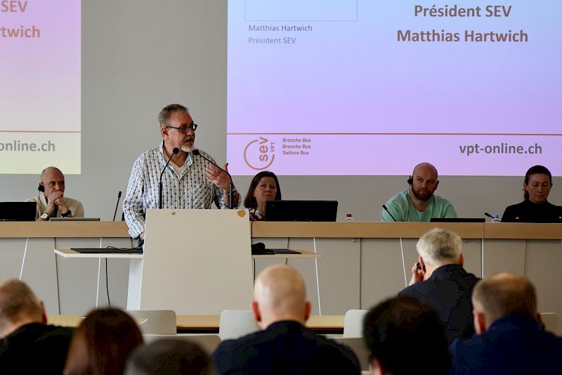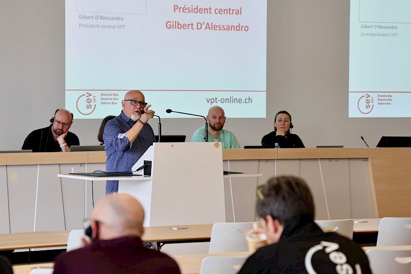 VPT-Zentralpräsident Gilbert D’Alessandro freute sich, die 60 Kolleginnen und Kollegen sowie Gäste aus Sektionen und Busunternehmungen aus der ganzen Schweiz begrüssen zu dürfen. Er erinnerte an die DNA von Branchentagungen: Momente des Austauschs, der Solidarität und der Anliegen unter Kolleginnen und Kollegen zu schaffen. Für ihn ist nach jahrelanger Beobachtung und Feststellung der gesundheitsbelastenden Arbeitsbedingungen der Zeitpunkt gekommen, zu stärkeren Mitteln zu greifen, um sich Gehör zu verschaffen. «Die Gesundheit am Arbeitsplatz ist heilig. Sie muss respektiert werden! Wenn wir Kolleg:innen haben, die schon mit 47 Jahren vom Beruf gezeichnet sind und nicht wissen, wie sie bis 65 durchhalten sollen, müssen wir gemeinsam eine Antwort finden! Die Gesundheit und Sicherheit unserer Kolleginnen und Kollegen ist kein Luxus, sondern eine Grundvoraussetzung für den öffentlichen Verkehr (öV). Das hat natürlich seinen Preis. Wir müssen handeln, bevor es zu Tragödien kommt.»