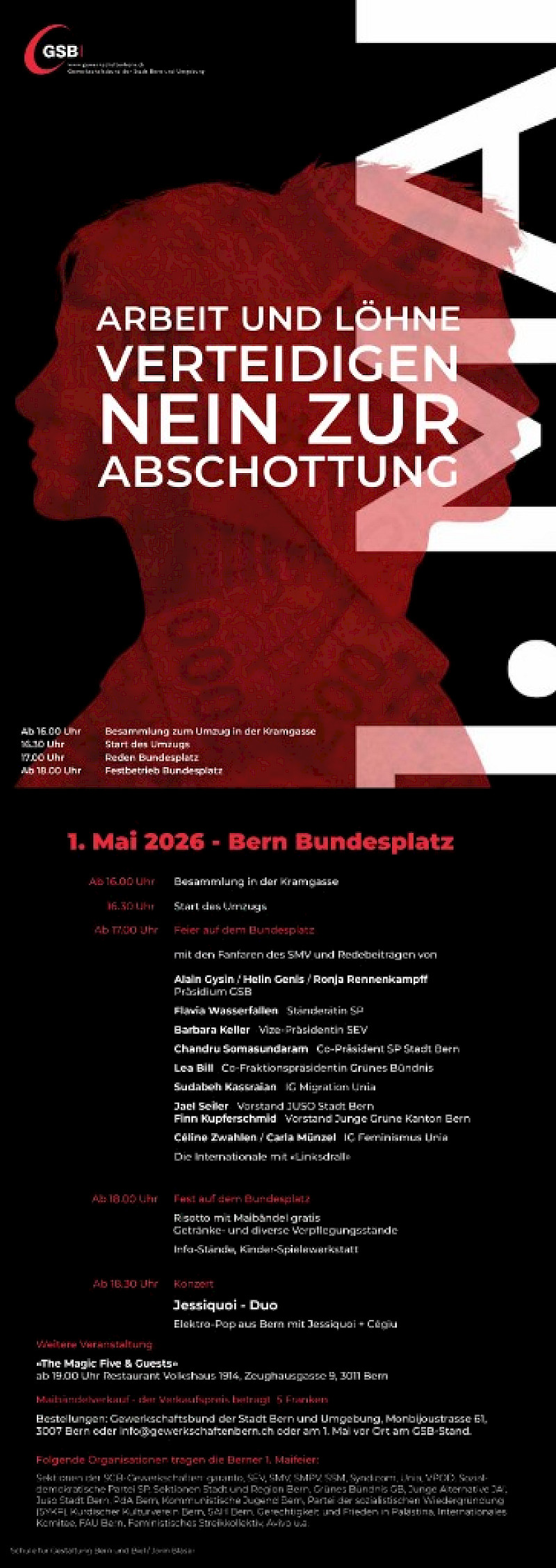 Der 1. Mai erinnert daran, dass uns nichts geschenkt wird. Das, was wir heute haben, haben die Generationen vor uns erstritten. Es steht viel auf dem Spiel. Die Welt ist unruhiger geworden. Das gilt nicht nur mit Blick auf die Weltpolitik, in der Kriege wieder fast «normal» geworden sind. Es gilt auch für die Angriffe auf unsere Errungenschaften. Es gibt in der Schweiz Kräfte, die den Arbeitnehmer:innen ihre verdienten Rechte nehmen wollen, sich selbst aber immer mehr Reichtum und Vermögen zuschanzen. Denen müssen wir entschieden entgegentreten.