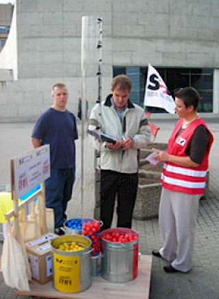 Aktivistinnen und Aktivisten der Gewerkschaft SEV-GATA zogen heute mit einem überdimensionierten Thermometer durch das Areal des Flughafens Zürich. Mitarbeiterinnen und Mitarbeiter des Luftverkehrs konnten mit farbigen Bällen ihre Einschätzung des eigenen Lohns markieren: Wer der Meinung war, zu wenig zu verdienen, warf einen roten Ball ein; gelb und blau standen für «genug» und «zu viel» zur Verfügung. Am Schluss war die Plastikröhre fast ausschliesslich mit roten Bällen gefüllt. Angestellte verschiedener Unternehmen der Luftfahrt nahmen an der Befragung teil. Für SEV-GATA-Präsident Philipp Hadorn kommt das Resultat nicht überraschend: «Nach mehreren Jahren mit Nullrunden beim Lohn besteht eindeutig ein Nachholbedarf.»