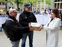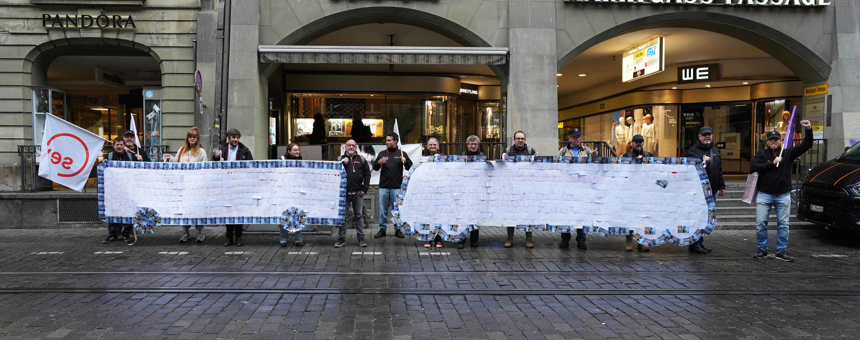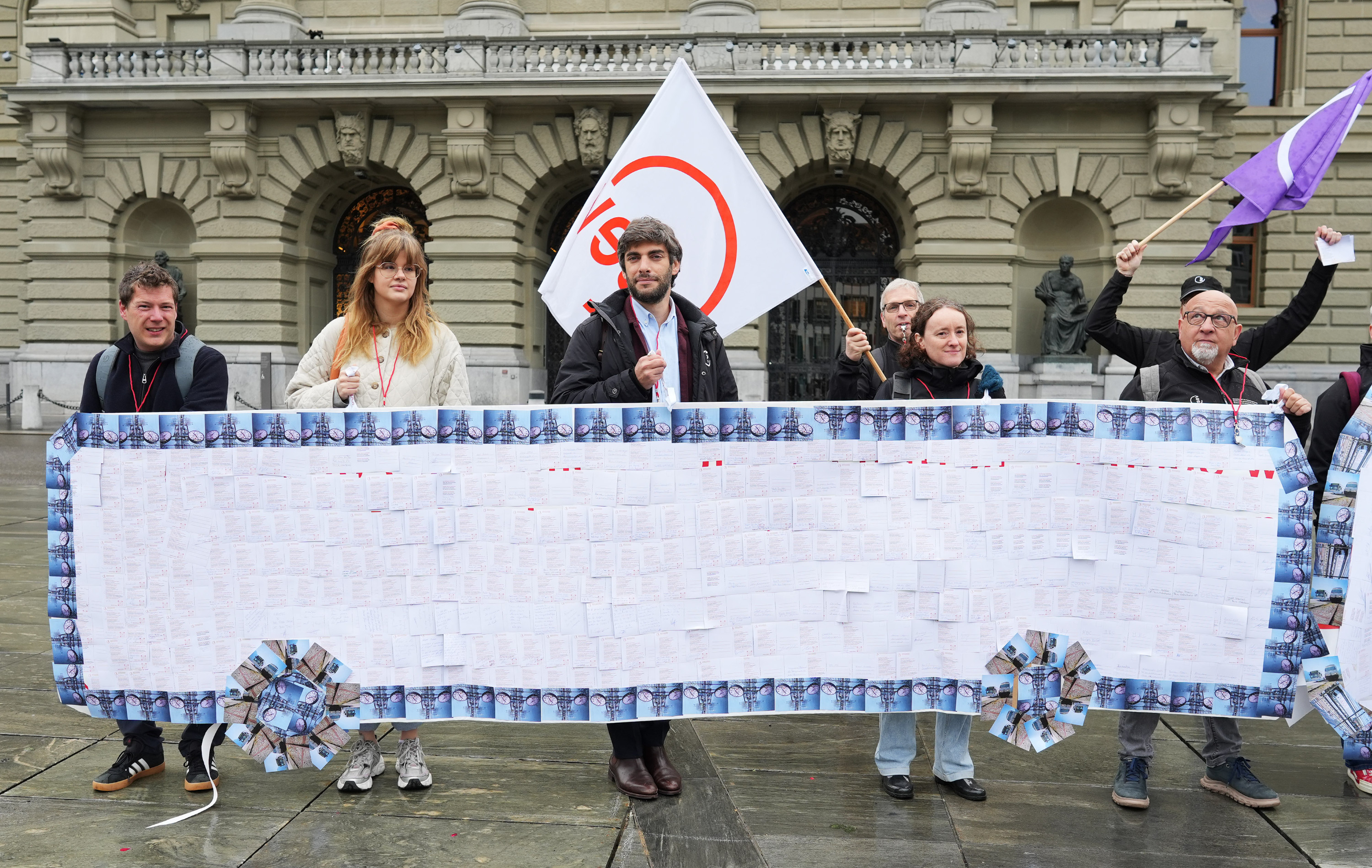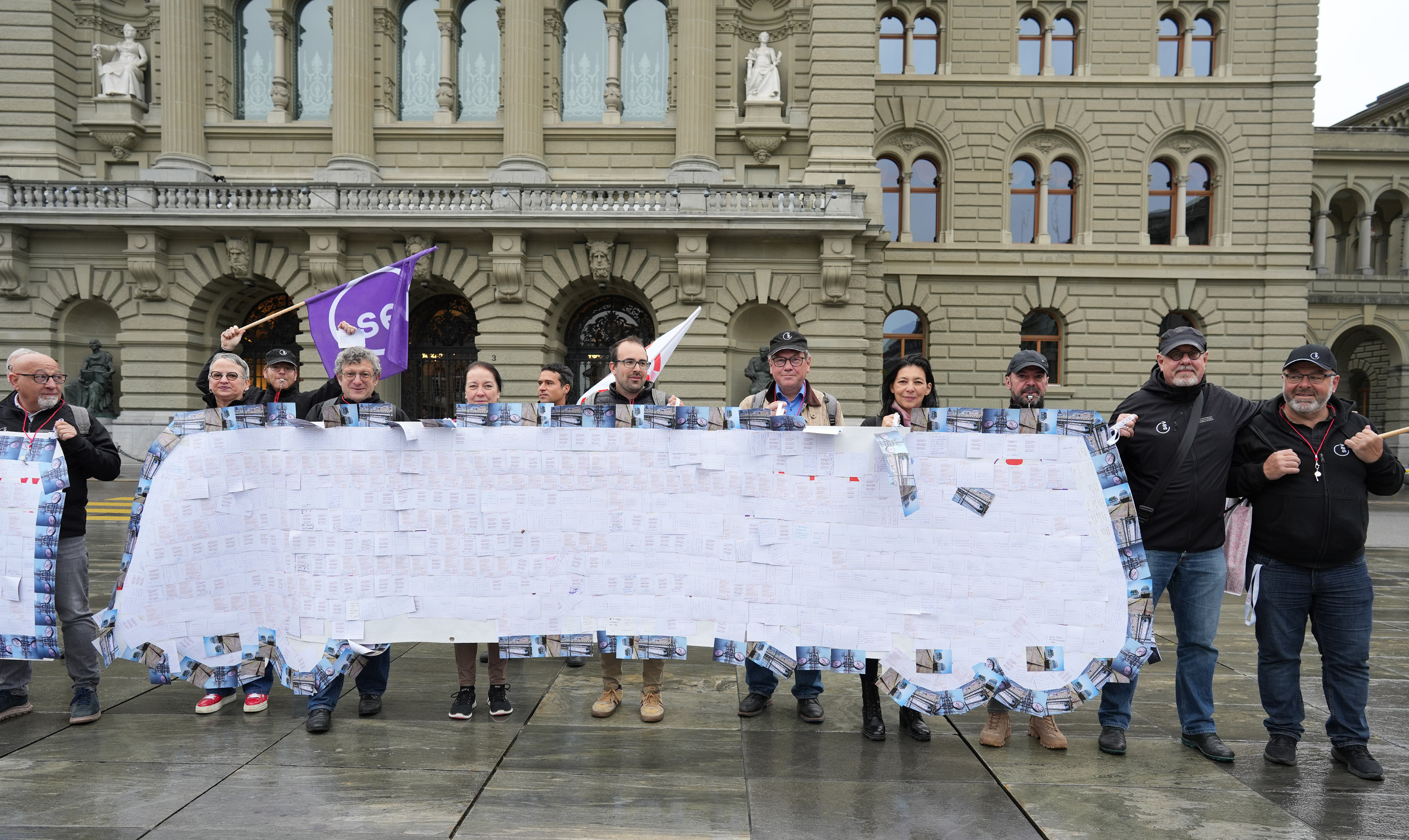 «Investieren statt Sparen! Mehr Geld für den öffentlichen Verkehr», «Zufriedene Mitarbeitende = ein starker öffentlicher Verkehr!» und «Mehr Personal, mehr Sicherheit, mehr öV – für die Mobilität der Zukunft!» Das sind Botschaften auf den Postkarten, die das öV-Personal an den Bundesrat geschrieben hat. Die Postkarten hat der SEV am 25. April 2025 in Form einer Collage als Bus und Zug der eidgenössischen Finanzverwaltung übergeben. Damit verleiht die Gewerkschaft der Befürchtung Ausdruck, dass letztlich das Personal für die vorgeschlagenen Sparmassnahmen im öV zahlen soll.