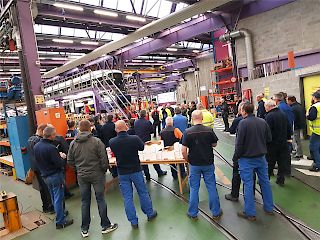 Il est midi. On pousse les tables pour poser les sandwichs et les boissons. Les pas et les voix résonnent dans ce hangar aux structures métalliques imposantes violettes et jaunes. Environ nonante personnes se mettent en arc de cercle et écoutent avec attention les délégués syndicaux. Les visages sont tendus et attentifs. Les paroles de Vincent Leggiero, président de la section SEV TPG, font mouche. Chacun se retrouve dans son énoncé des problèmes. D’autres collègues s’expriment également.