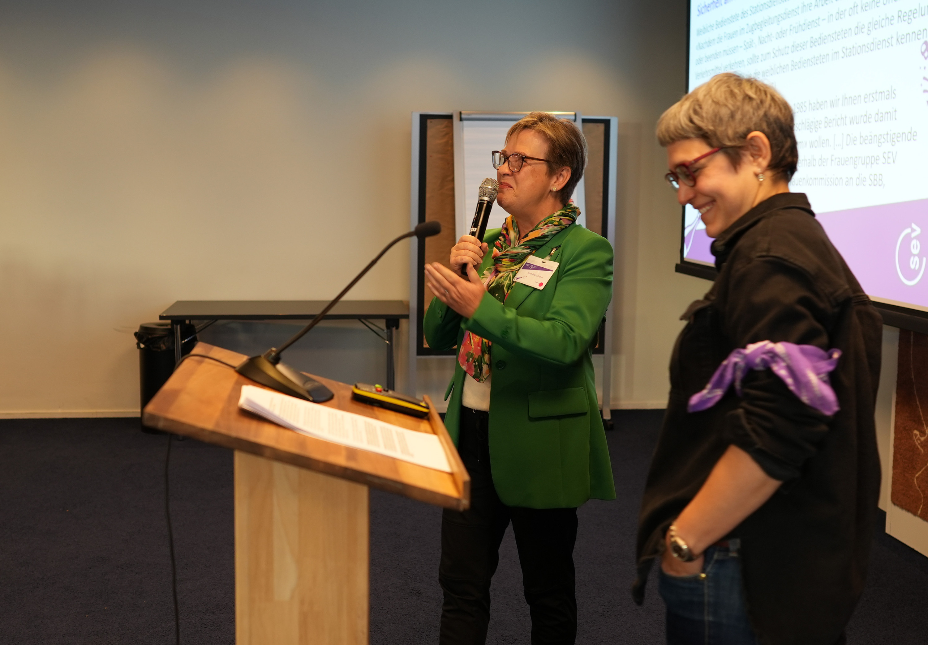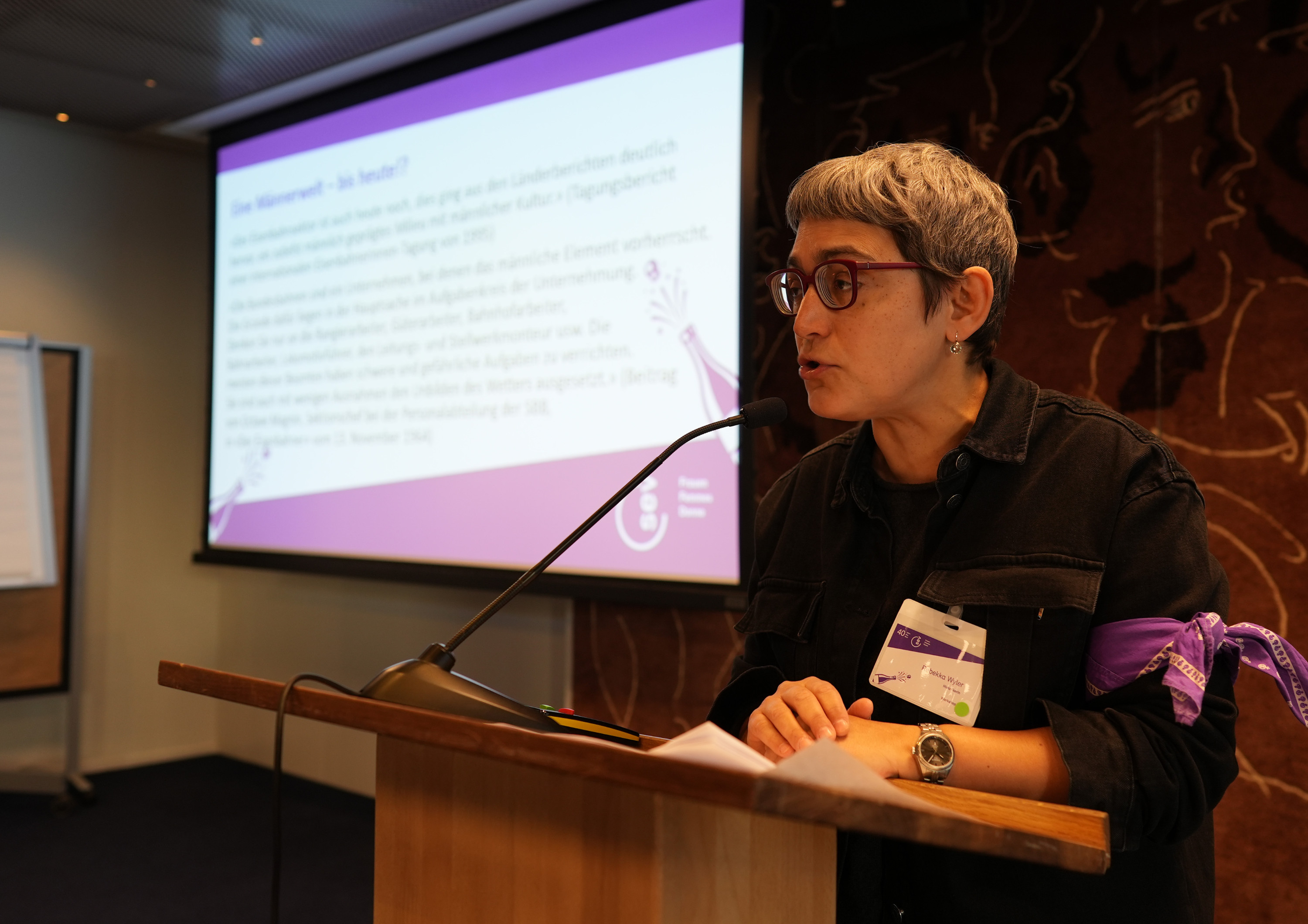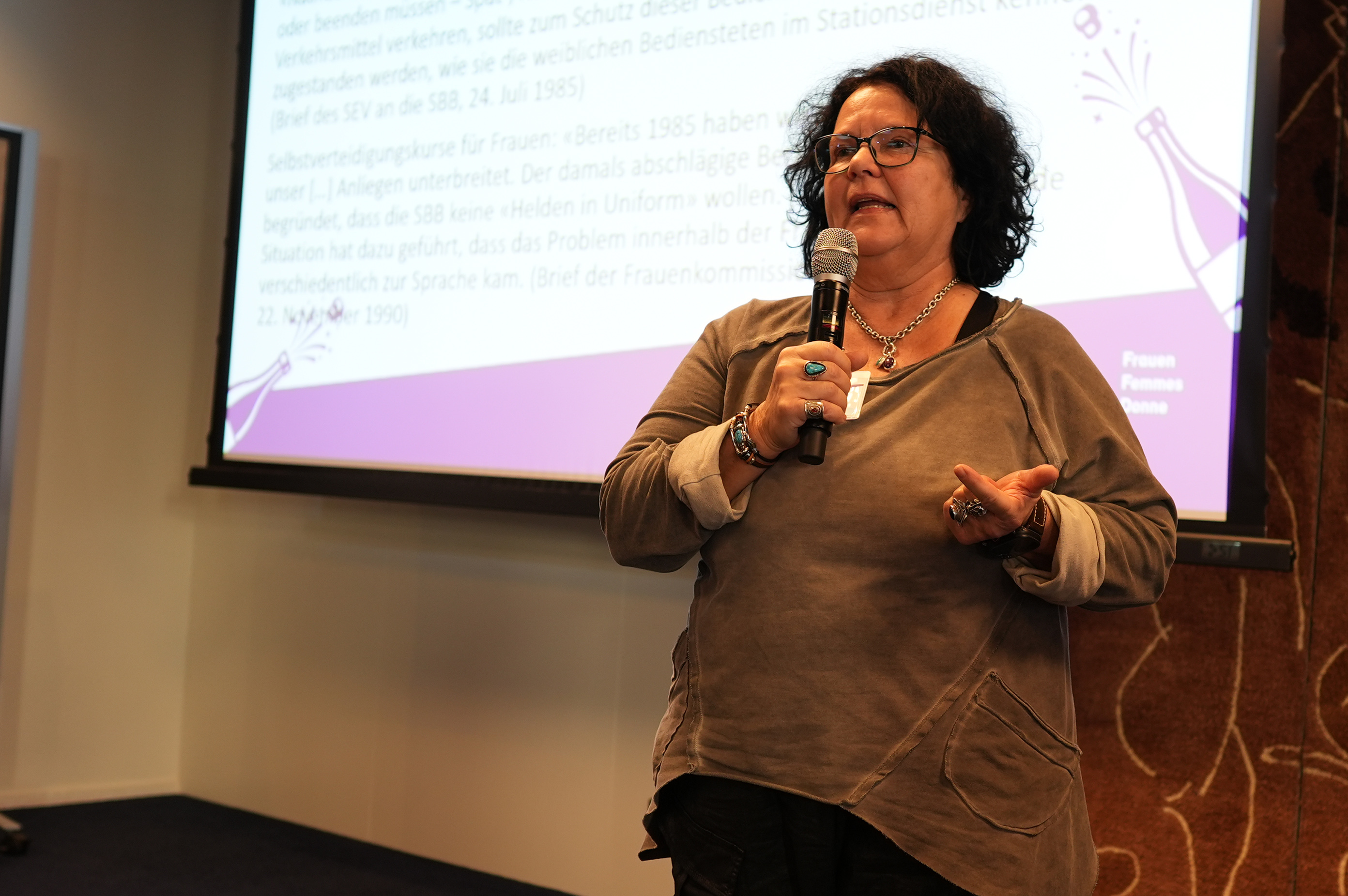 « 40 ans d’engagement pour l’égalité, la solidarité et la voix des femmes dans les transports publics ». C’est ainsi que Sibylle Lustenberger accueille les participant·es à la journée de formation et d’anniversaire de la Commission des femmes du SEV le 28 novembre 2025 à l’Hôtel Bern. Elle souligne qu’il ne s’agit pas seulement d’une célébration, mais d’un regard rétrospectif sur les luttes, les acquis et la nécessité toujours actuelle de cette commission. Sibylle Lustenberger, responsable depuis un an de l’égalité et de la formation au SEV, rappelle que la Commission des femmes est depuis quarante ans un lieu où les femmes peuvent rassembler leurs préoccupations et les rendre visibles. Elle rend hommage aux pionnières et remercie toutes les personnes présentes pour leur inlassable engagement .
