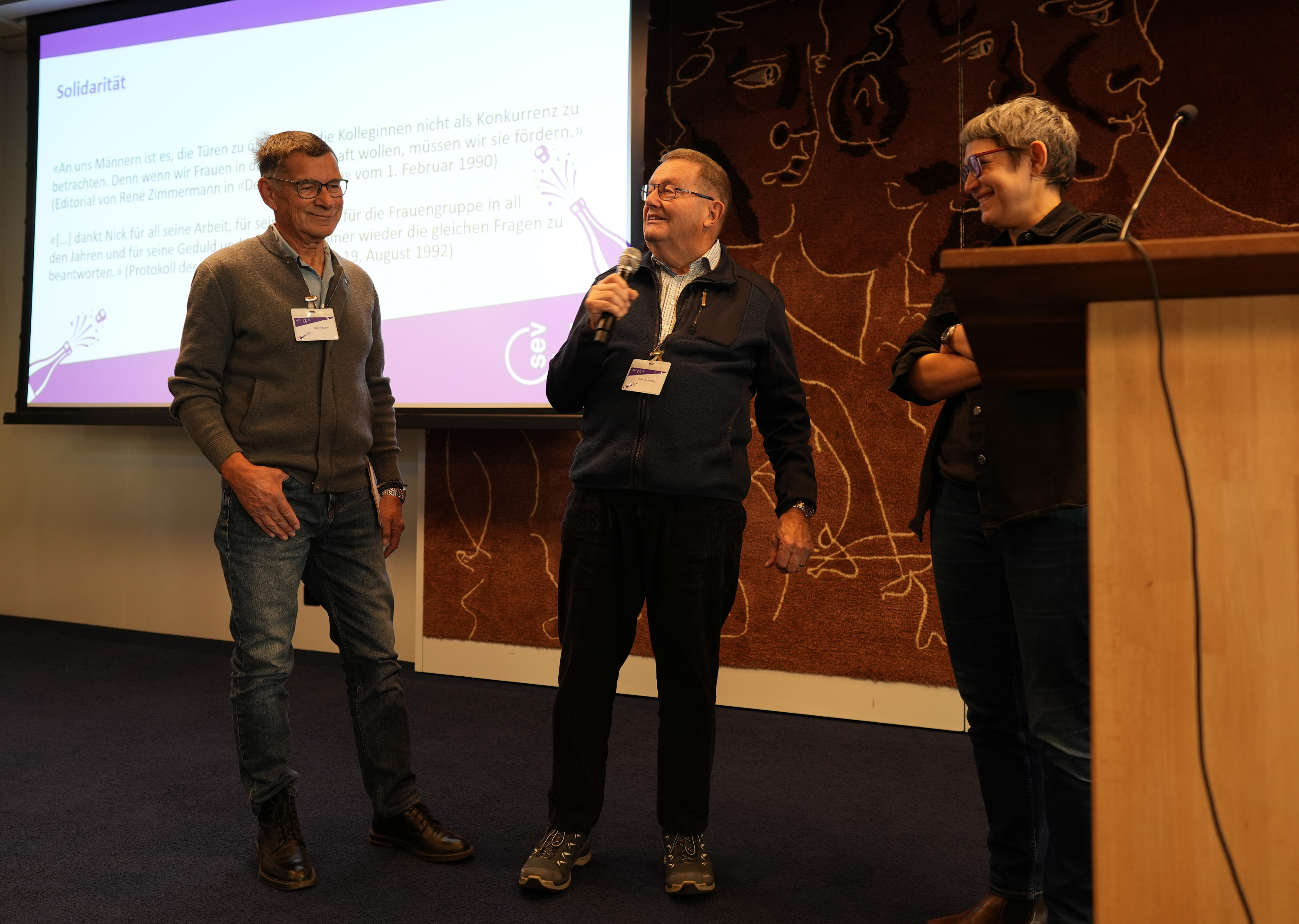 Le regard historique est assuré par la syndicaliste et historienne Rebekka Wyler. Ces derniers mois, elle a fouillé les archives, consulté d’anciens procès-verbaux et photos et mené de nombreux entretiens. Sa recherche montre que les femmes sont présentes dans les transports publics dès les années 1930 – comme garde-barrières, cuisinières ou couturières. Mais elles restent minoritaires et doivent s’unir pour être prises au sérieux. Un tract de 1971 formule avec prudence : « Nous aimerions enfin pouvoir agir nous-mêmes ou au moins aider à participer aux décisions. » Le moment n’est pas anodin : peu auparavant, le droit de vote des femmes a été introduit. En 1983, une demande de création d’un groupe de femmes est déposée au congrès du SEV, en 1984 les travaux commencent et en 1985 a lieu la première journée. Les femmes sont soutenues par des hommes solidaires comme René Zimmermann et Nick Raduner, secrétaires syndicaux qui accompagnent le groupe. À l’époque, il n’y avait pas encore de secrétaires syndicales au SEV, et de nombreux collègues masculins se montraient sceptiques face à l’idée d’une commission féminine. « Honnêtement, au début je n’étais pas enthousiaste à l’idée d’assumer cette tâche », se souvient René Zimmermann, présent avec Nick Raduner. « Mais j’ai rapidement compris combien il est important d’accorder sa confiance et de se mettre, même du point de vue syndical, à la place des collègues. » Nick Raduner évoque la première grève des femmes de 1991, à laquelle il participe avec sa fille – un moment clé qui contribue à l’ancrage définitif de la Commission des femmes.