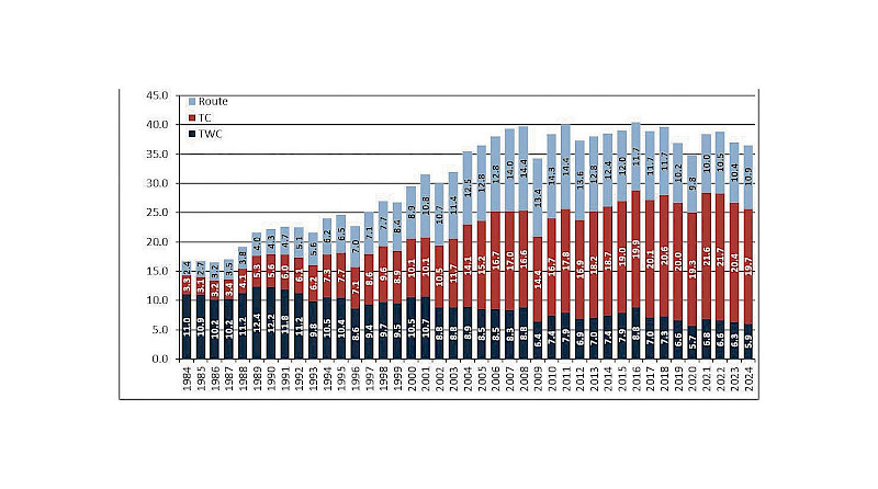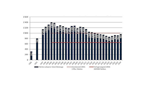 En 2024, les prestations de transport routier et ferroviaire en Suisse (pas seulement dans le transit alpin) ont atteint un total de 26,1 milliards de tonnes-kilomètres, soit pratiquement le même niveau que l’année précédente (-0,1 %), comme l’a annoncé l’Office fédéral de la statistique (OFS) en novembre. Toutefois, le transport routier de marchandises a augmenté de 1,4 % par rapport à 2023 pour atteindre 16,5 milliards de tonnes-kilomètres, tandis que le transport ferroviaire de marchandises a diminué de 2,6 % pour s’établir à 9,6 milliards de tonnes-kilomètres. Ce dernier a ainsi atteint son niveau le plus bas depuis 15 ans, le dernier niveau inférieur ayant été enregistré en 2009. En raison de ces évolutions contraires, la part de la route dans les prestations de transport a augmenté d’un point de pourcentage pour atteindre 63 %, tandis que celle du rail a baissé à 37 %.