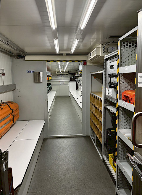 « Chacune des deux voitures de secours dispose de 60 places et nous pouvons administrer les premiers soins. Nous avons suivi une formation sanitaire de base pour cela mais, en règle générale, un membre de l’équipe ambulancière nous accompagne toujours en cas d’intervention », nous explique Nadir. Les compartiments de ces voitures sont équipés d’un système de ventilation indépendant de l’air extérieur, de sorte qu’en cas d’incendie dans le tunnel, la fumée ne puisse pas y pénétrer et que l’on puisse respirer. Après les voitures de secours et le wagon-citerne, nous trouvons la voiture de secours utilisée en cas de déraillement, et enfin le wagon chimique qui est géré pour nous par les pompiers de Bellinzone, qui s’occupent des interventions chimiques sur toute la ligne ferroviaire du Sopra Ceneri et des tunnels de base du Saint-Gothard (en collaboration avec l’usine chimique d’Uri) et du Monte Ceneri (en collaboration avec les pompiers de Lugano).